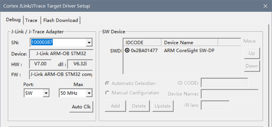 为了能使用 ARM 调试器连接到 ARM 内核,而不是 FPGA需要把 JTAG_SEL 引脚置为低电平。使用 ARM 调试器,如 JLink对应连接 JTAG 口的 TMS、TCK、GND 引脚,如果连接正常,可以检测到 ARM 芯片,如下图所示: