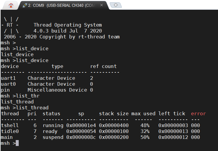 移植了 RT-Thread 内核支持线程调度、线程间同步和通信等目前已经完成了PIN、Serial设备驱动FinSH组件默认使用uart0设备。
