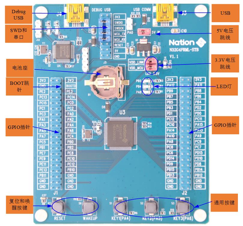 N32G4FRML-STB 是国民技术推出的一款N32G4FR系列的评估板,该开发板具有丰富的板载资源,开发板外观如下图所示: