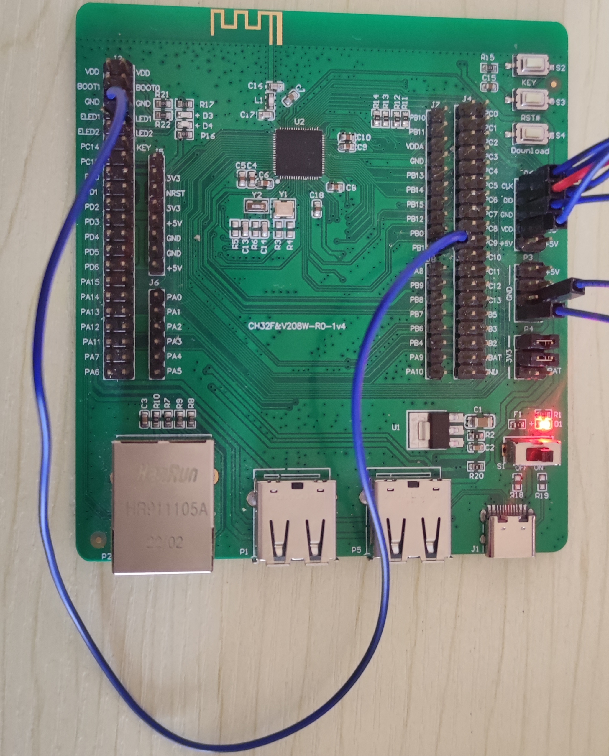 By default, the project performs a blinking LED function. ch32v208w-r0, the default on-board LED is not directly connected to the pin, the user needs to manually connect the LED to the control pin using a duplex cable, the phenomenon is shown below: